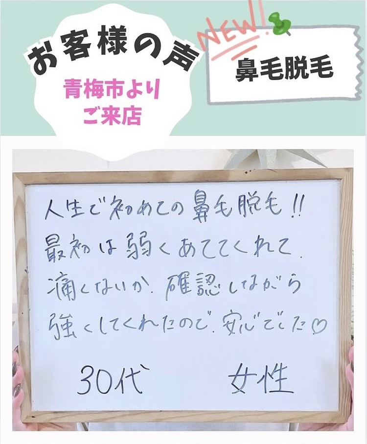 人生で初めての鼻毛脱毛‼最初は弱くあててくれて、痛くはないか確認しながら強くしてくれたので、安心でした♡